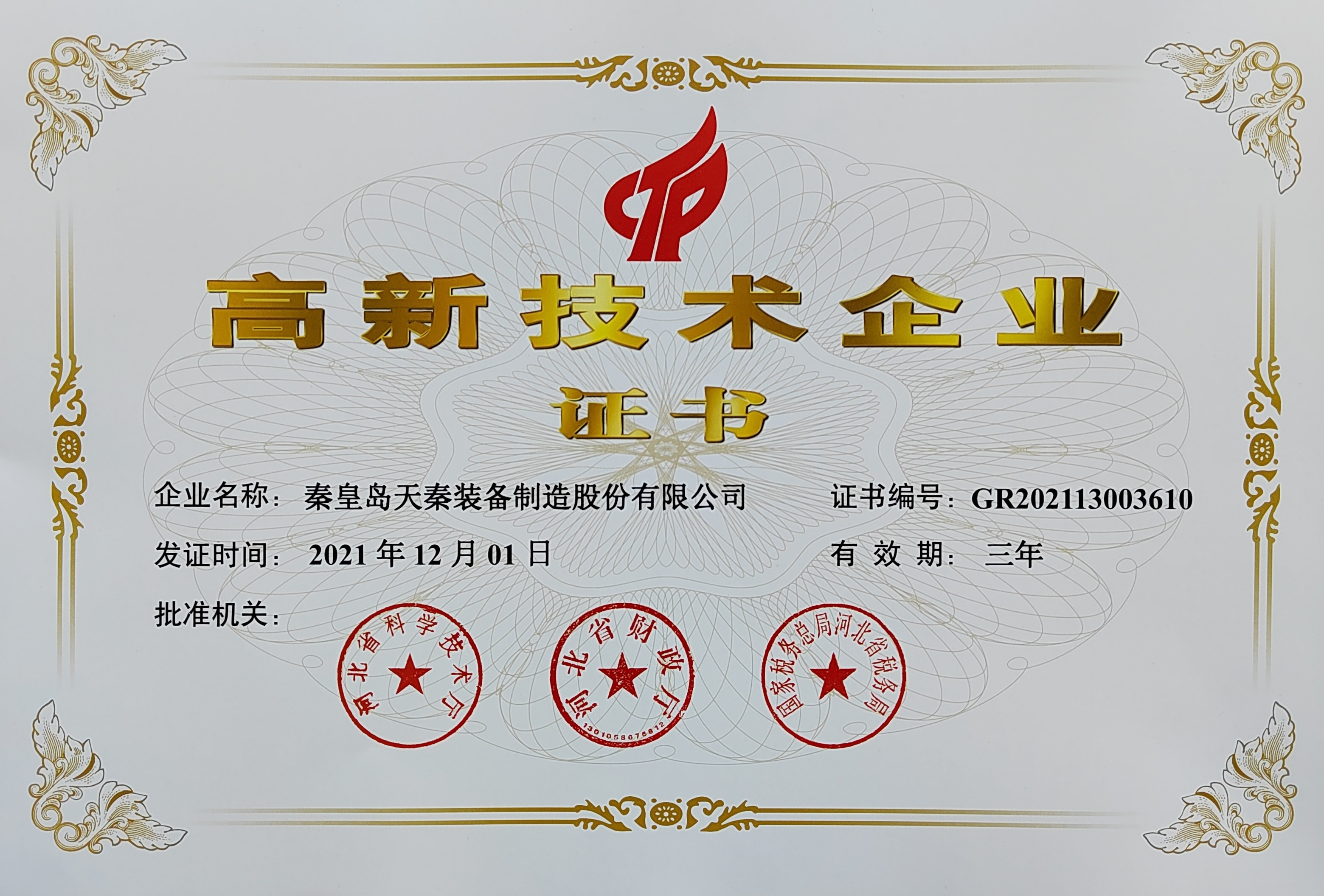 - 秦皇島天秦裝備制造股份有限公司創立于1996年,總部位于河北省秦皇島市經濟技術開發區,秦皇島廠區占地4萬平方米,擁有3萬平方米的標準廠房、辦公樓和工程技術研發中心;分部天津廠區位于天津市靜海經濟開發區,占地2萬平方米,擁有1.6萬平方米標準廠房。 公司通過了GB/T 19001質量管理體系及GB/T 24001環境管理體系認證,是國家高新技術企業、河北省軍民融合產學研用創建基地,建有省級院士工作站。